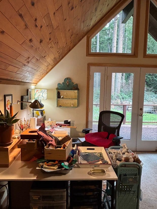 And somewhere in there was a very exciting conversation which led to a decision to offer an online assemblage art class this Spring (you heard it here first!), which made it suddenly seem essential to relocate my main craft table to a new spot where I now have two all-important things that were missing from my prior space: natural light and a door to close. This re-design required me to wait until last weekend when I could finally enlist the aid of Mr. Goodness and our darling Goodlet to move many many pieces of very heavy furniture (note to self: next lifetime, all furniture is to be light and on wheels!).