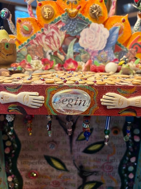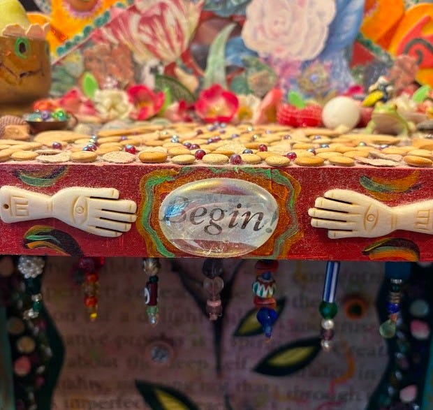 As I restart my creative practice for the zillionth time, I arrive with one piece already in progress (a sweet little ode to gentleness as strength), another that is vaguely conceptualized, and a whole stack of absolutely filthy but promising boxes (scavenged for me from a local golf course by my part-vulture friend Carrie) that are just begging to get cleaned up so they can house a series of small collages.