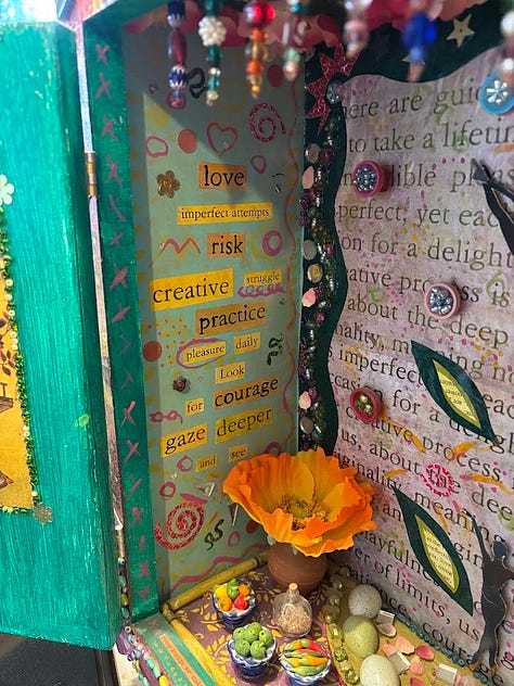 Sara Saltee is an artist, writer, and creativity coach living on Whidbey Island, Washington. Through her writing, coaching, and workshops, she provisions creative humans for the adventure of a lifetime. In the studio, she conjures enchanting little worlds in shrines and shadow boxes.