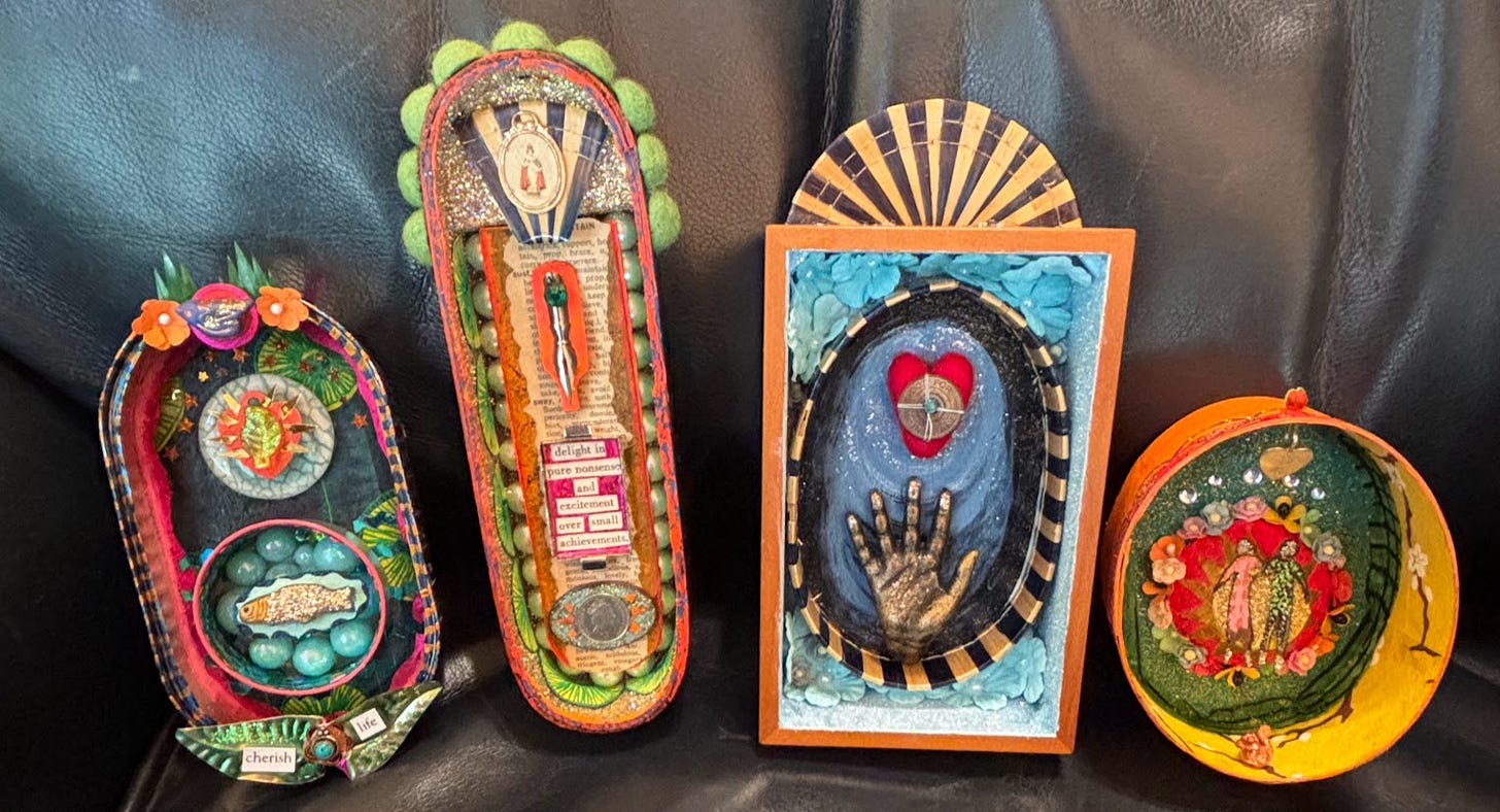 Then came the assignment to make a couple of exemplars so we could show the kind of little shrines that workshop participants might like to make. Suddenly, I had a reason to look at lots of images of small shrines and altars made in the Mexican folk art tradition that first inspired me as a gringo kid growing up in New Mexico.